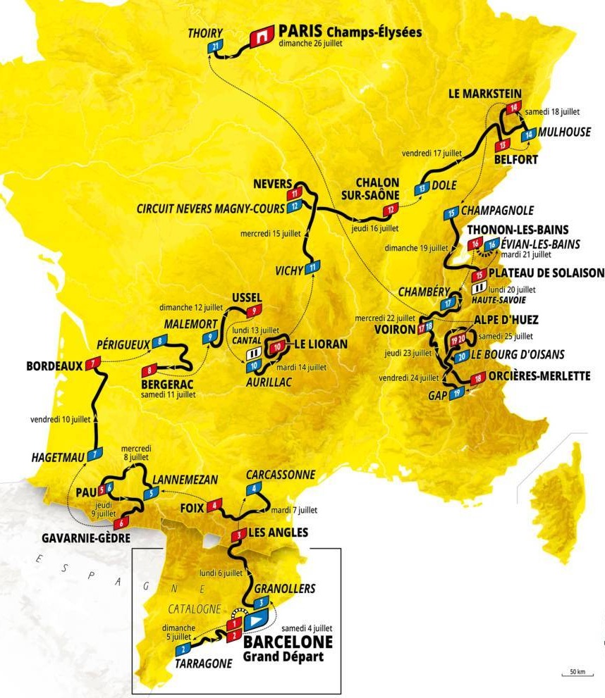 Cette édition débutera par un contre-la-montre par équipes dans les rues de la capitale catalane — une première depuis 1971 — avant de traverser sept régions françaises et vingt-neuf départements, pour un total de 3 333 kilomètres et 54 450 mètres de dénivelé positif.