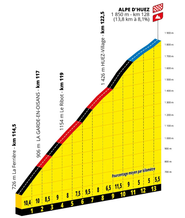 - Arrivée (Km 128) : Alpe d'Huez - 1850 m - 13,8 km à 8,1%