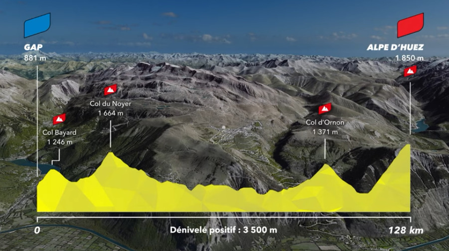 Cette 19ᵉ étape conduira les coureurs de Gap à l’Alpe d’Huez sur un tracé court et explosif de 128 km. L’ascension du col Bayard dès le départ donnera le ton, avant les passages par le col du Noyer et le col d’Ornon, qui précéderont la mythique montée des 21 virages de l’Alpe d’Huez (13,8 km à 8,1 %). Une arrivée légendaire à 1 850 m d’altitude, la première de deux journées consécutives à l’Alpe d’Huez, qui pourrait relancer la bataille entre les favoris.
