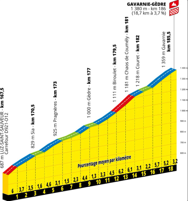 - Arrivée (Km 186) : Gavarnie-Gèdre - 1380 m - 18,7 km à 3,7%