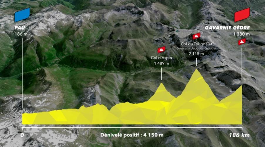 Cette 6ᵉ étape mènera les coureurs de Pau à Gavarnie-Gèdre sur un tracé montagneux de 186 km. Après un départ dans la plaine béarnaise, le peloton s’attaquera à des cols majeurs comme le Col d’Aspin puis le Col du Tourmalet, avant une arrivée inédite au sommet de Gavarnie-Gèdre, dans le massif des Pyrénées. Avec un dénivelé positif annoncé à 4150 m ainsi que 18,7 km d’ascension finale à 3,7 % de moyenne, cette étape s’annonce comme un tournant clé pour les favoris en montagne.