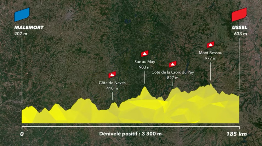 Cette 9ᵉ étape reliera Malemort-sur-Corrèze à Ussel sur un parcours de 185 km au cœur du Massif central. Après un départ depuis la vallée de la Dordogne, le peloton gagnera progressivement l’intérieur des terres corréziennes, sur des routes vallonnées et sinueuses typiques du département. Le profil annoncé comme vallonné à exigeant devrait favoriser les baroudeurs solides et les coureurs résistants aux efforts de moyenne montagne, avant de se conclure à Ussel, sur un final accidenté.